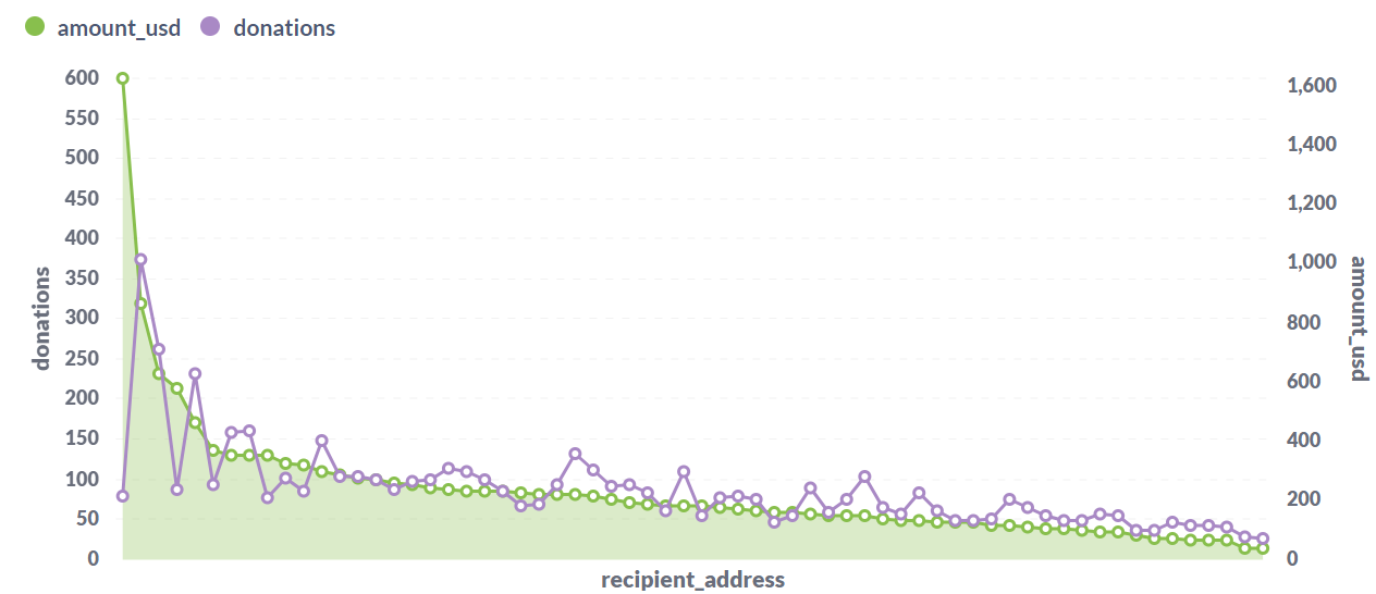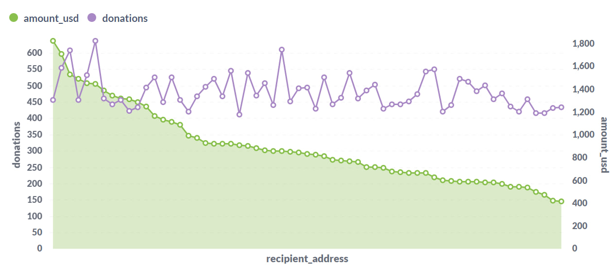 The chart is ordered by total dollar value of donations obtained by each recipient, starting from grant with highest total of donations received placed on the left.
